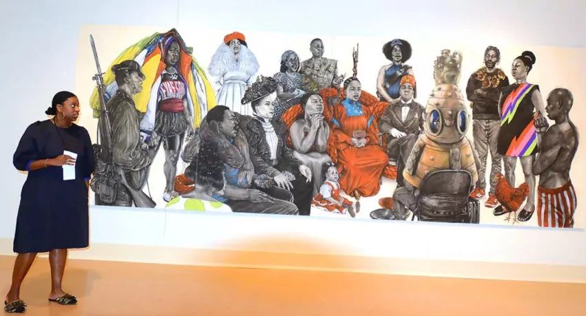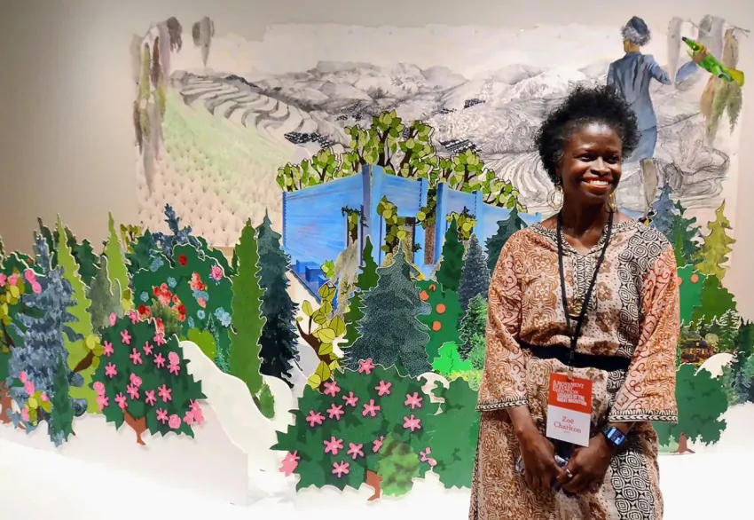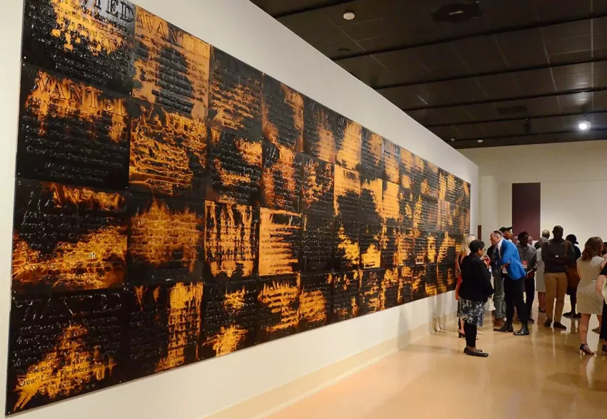 The exhibit features work by acclaimed Black artists, including Akea Brionne, Mark Bradford, Zoë Charlton, Larry W. Cook, Torkwase Dyson, Theaster Gates Jr., Allison Janae Hamilton, Leslie Hewitt, Steffani Jemison, Robert Pruitt, Jamea Richmond-Edwards, and Carrie Mae Weems. The works explore “profound impact of the Great Migration on the social and cultural life of the United States from historical and personal perspectives,” museum officials explained.
