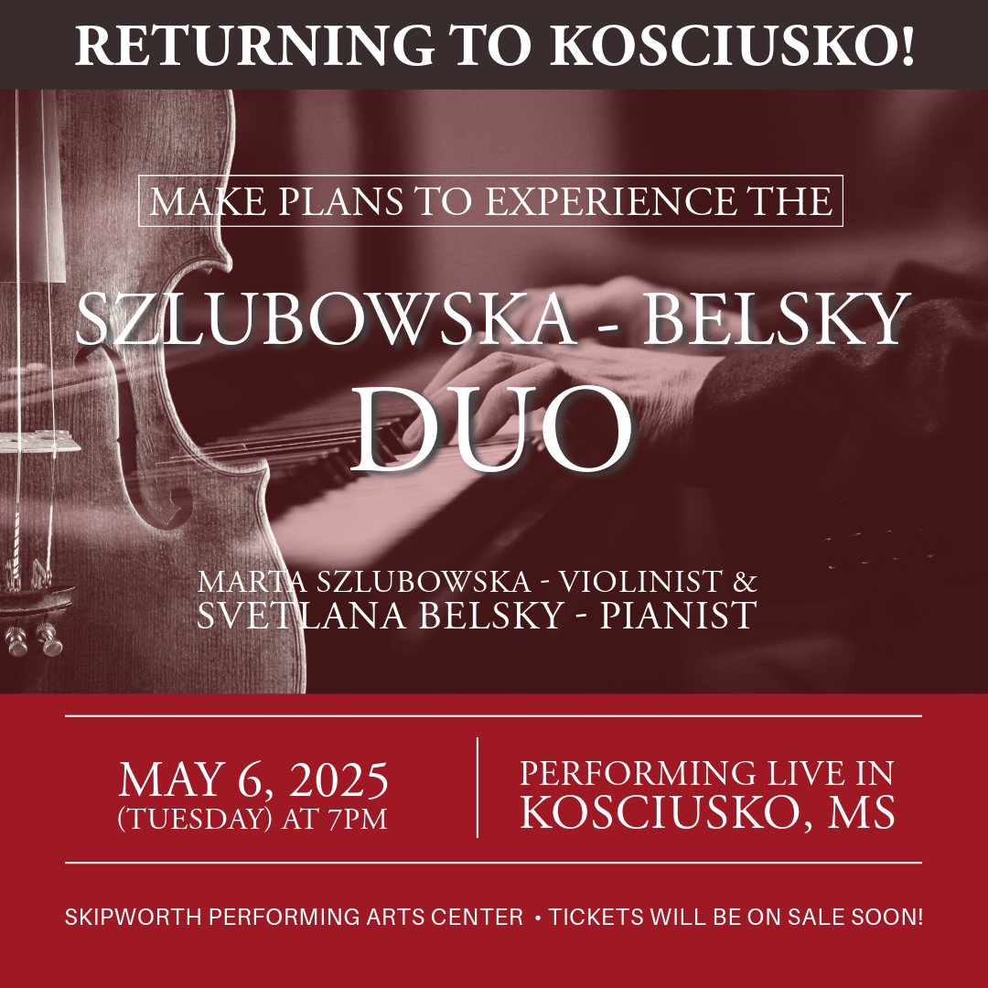 KOSCIUSKO, Miss. (AP) — The internationally acclaimed Szlubowska-Belsky Duo will return to the Skipworth Performing Arts Center on Tuesday, May 6, 2025, for an evening of classical music honoring Polish and Ukrainian composers—and more.