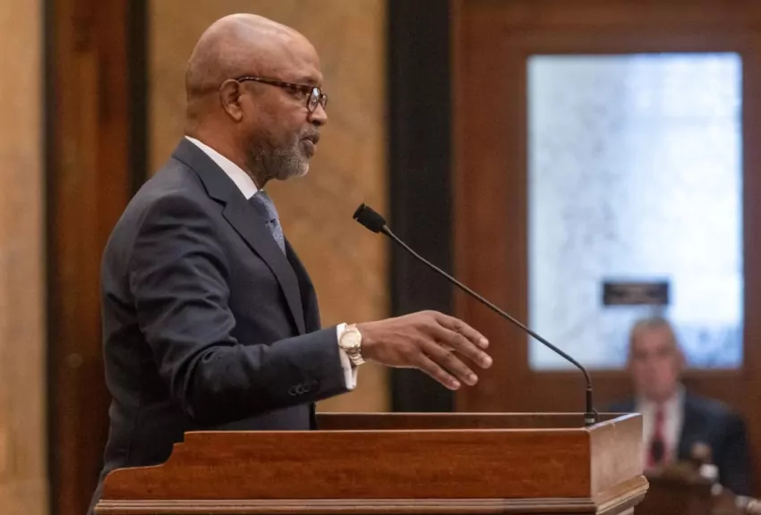 Rep. Robert Johnson, D-Natchez, speaks to lawmakers at the State Capitol in Jackson, Miss., Thursday, Jan. 18, 2024, during a special legislative session called by Gov. Tate Reeves to approve an economic development project in North Mississippi. Credit: Eric J. Shelton/Mississippi Today
