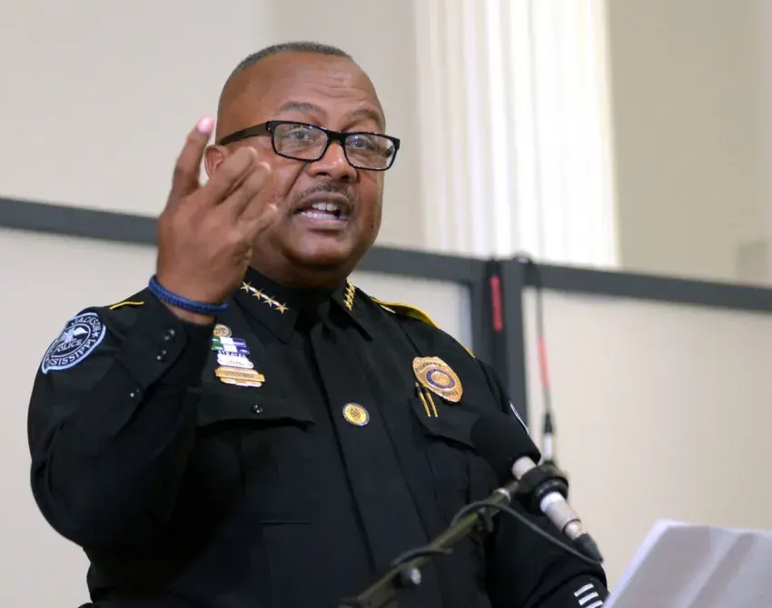 Jackson Police Chief Joe Wade, speaks with homeless individuals regarding recent legislation prohibiting squatting, encampments, and panhandling without a permit, at Stewpot, Thursday, July 3, 2025 in Jackson. Credit: Vickie D. King/Mississippi Today