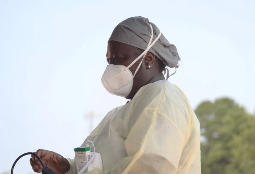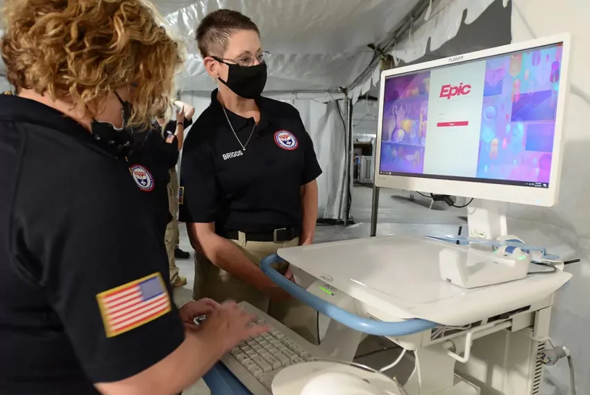 Federal employees made up of doctors, nurses, respiratory therapists and paramedics sent to staff the field hospital at UMMC set up equipment in the basement of Parking Garage B, Thursday, Aug. 12, 2021 in Jackson. UMMC needed the help because of a lack of resources during a recent surge in coronavirus cases. Credit: Vickie D. King/Mississippi Today