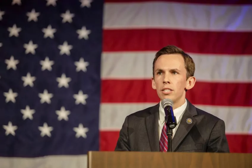 Jason McCarty, Capital City Pride Executive Director (center) and Eleven Cook, were among a group of demonstrators protesting the University of Mississippi Medical Center's decision to close TEAM Clinic that provided care for the LGBTQ+ community, Tuesday, June 6, 2023 in Jackson. Credit: Vickie D. King/Mississippi Today