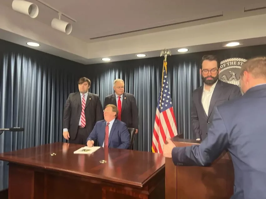 Gov. Tate Reeves shares a laugh with Rep. Nick Bain, R-Corinth, left, and Rep. Gene Newman, R-Pearl, at a bill signing Tuesday, Feb. 28, 2023, where he signed into law legislation banning gender-affirming care for trans minors. To the right, Daily Wire columnist Matt Walsh joins Sen. Joey Fillingane, R-Sumrall, in preparing for a news conference. Credit: Molly Minta/Mississippi Today