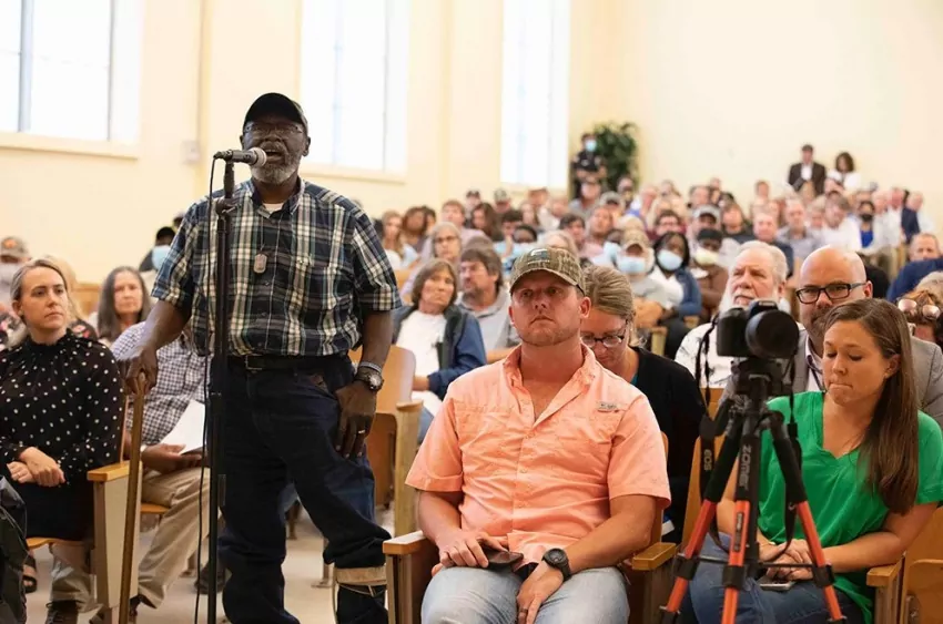 Anderson Jones Sr. talks about lifving with substantial and repeated flooding in the Mississippi Delta during a community meeting on Aug. 29, 2022, at South Delta High School in Rolling Fork, Miss. Residents gathered to discuss the current state of affairs with representatives from agencies of the federal government and U.S. U.S. Rep. Bennie Thompson and U.S, Sen. Roger Wicker. Sarah Warnock/MCIR