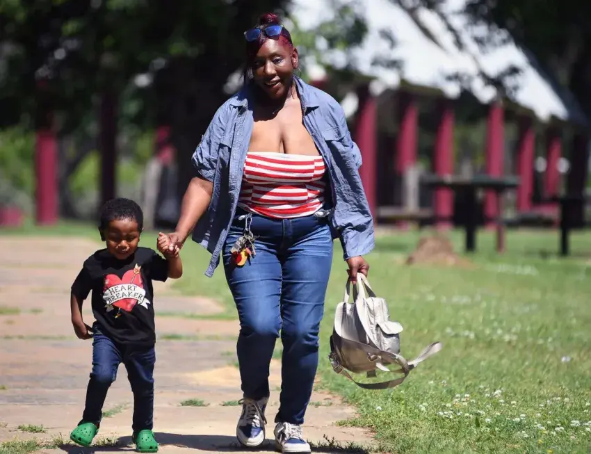 Sequaya Coleman and her 2-year-old son Christian White, enjoying a morning at Hico Park in Jackson, Monday, April 28, 2025. Coleman, a housekeeper, wants a Child Care Payment Program voucher so she can keep workinig. Credit: Vickie D. King/Mississippi Today