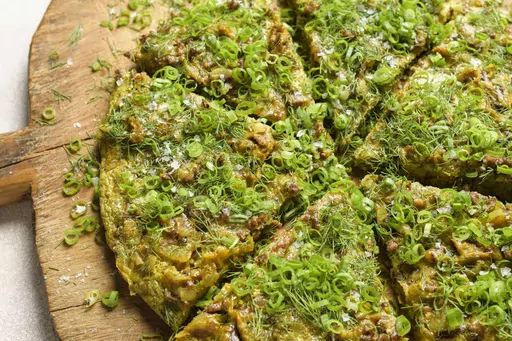 We keep things lighter and more flavorful with Egypt’s spiced frittata-like eggah, which is substantial but balanced, with layer upon layer of flavor thanks to a trio of spices and fresh herbs and scallions.