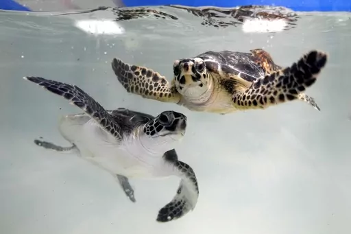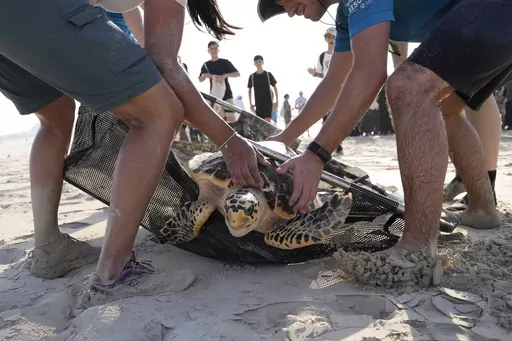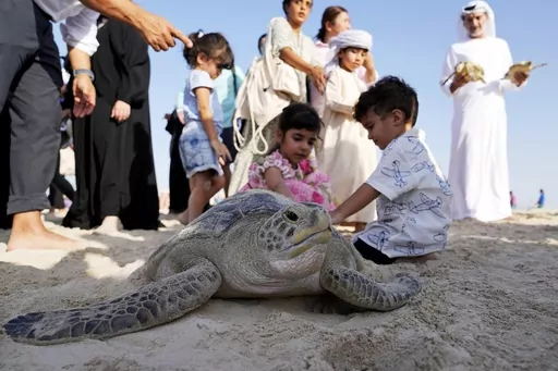 ABU DHABI, United Arab Emirates (AP) — The baby sea turtle flapped its flippers as it was lowered into the ocean, only to be pushed back ashore by the strong tide. It tried again, and this time it made it, swimming fast and deep into Persian Gulf waters lapping at a string of beachfront tourist resorts.